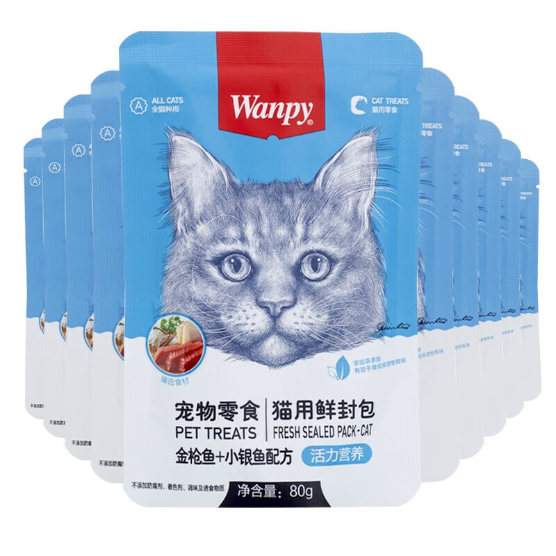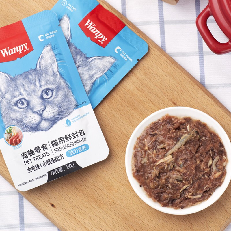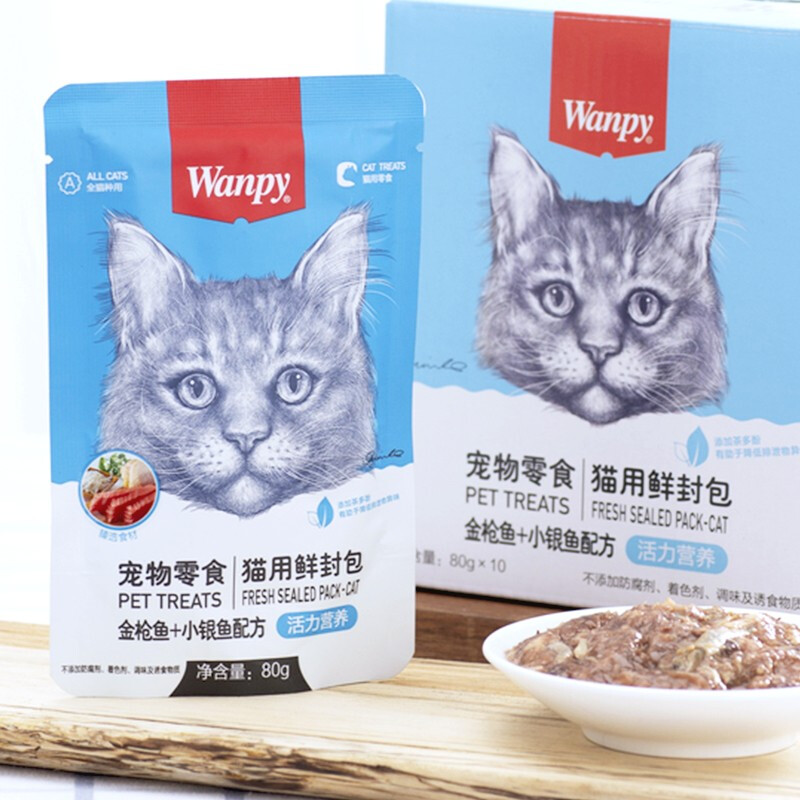 顽皮(wanpy)猫咪鲜封包活力营养宠物猫粮肉粒包猫湿粮猫罐头整盒 金枪鱼 小银鱼80g*10