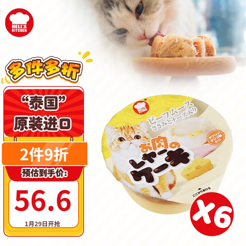 地狱厨房(Hell's Kitchen)成幼猫咪湿粮 增肥营养猫零食罐头 泰国进口蛋糕塔塔杯 鸡肉牛肉奶酪味80g*6个