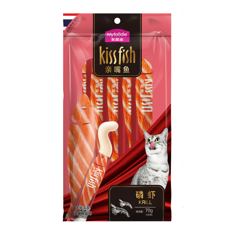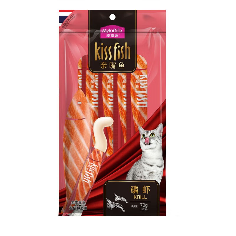 麦富迪(Myfoodie)亲嘴鱼猫条 猫湿粮秒鲜肉粒包流质补水增肥发腮成幼猫通用 亲嘴鱼磷虾14g*5支装