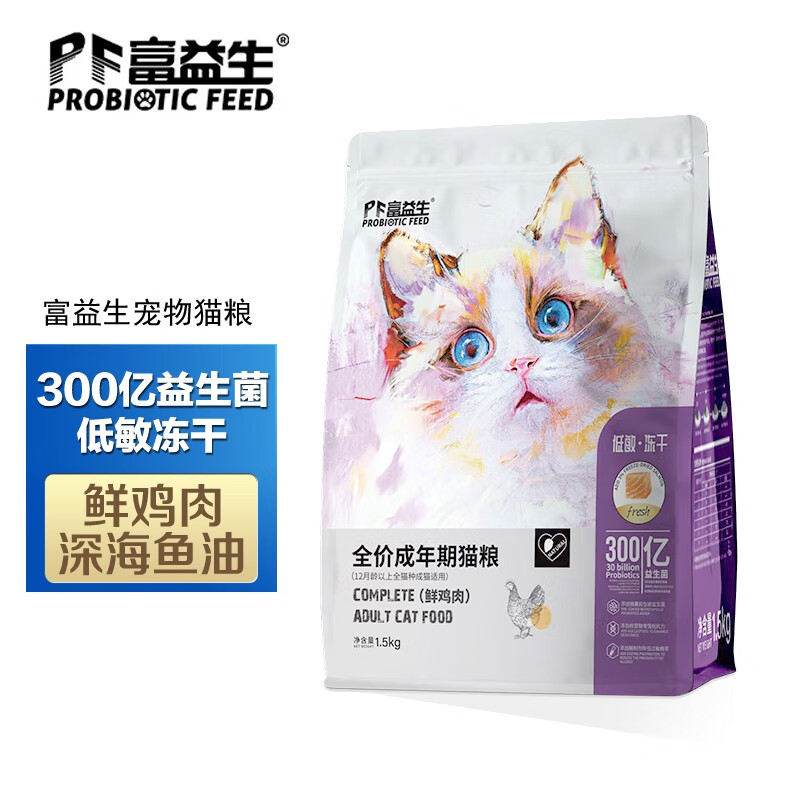 富益生 低敏冻干全价成年期幼年期猫粮英短蓝猫渐层布偶加菲德文渐幼猫成猫粮通用营养高蛋白益生菌通用粮 鲜鸡肉成猫粮1.5kg