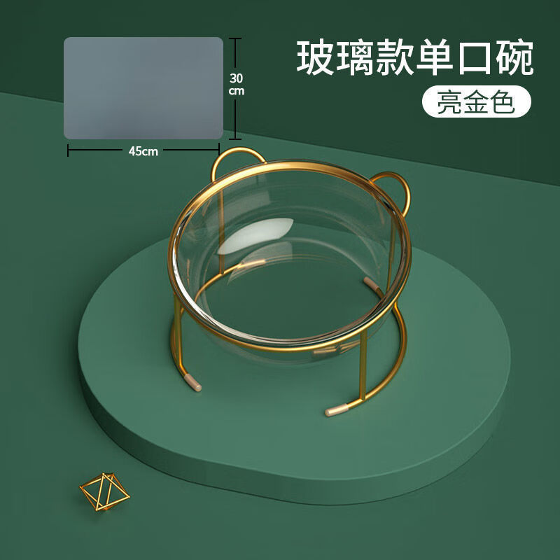 宠物猫碗双碗保护颈椎狗碗猫盆幼猫防打翻宠物玻璃碗猫粮碗猫食盆 玻璃单碗 亮金色支架 PVC餐垫 稳固安全材质-破损当日补发