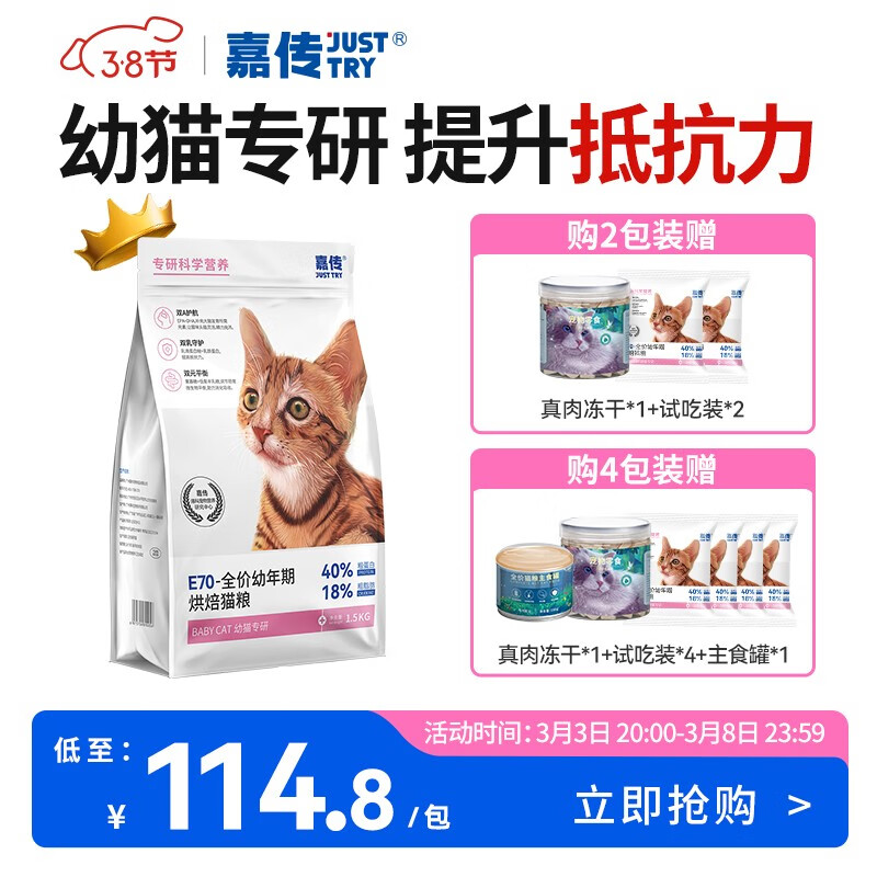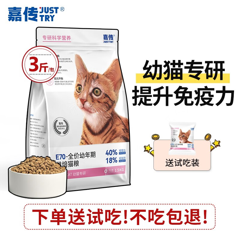 嘉传E70低温烘焙全价无谷幼猫4到12月布偶蓝猫奶糕离乳孕猫专用猫主粮 E70幼猫专研烘焙猫粮 6kg 4包装 4包试吃【囤货优选】