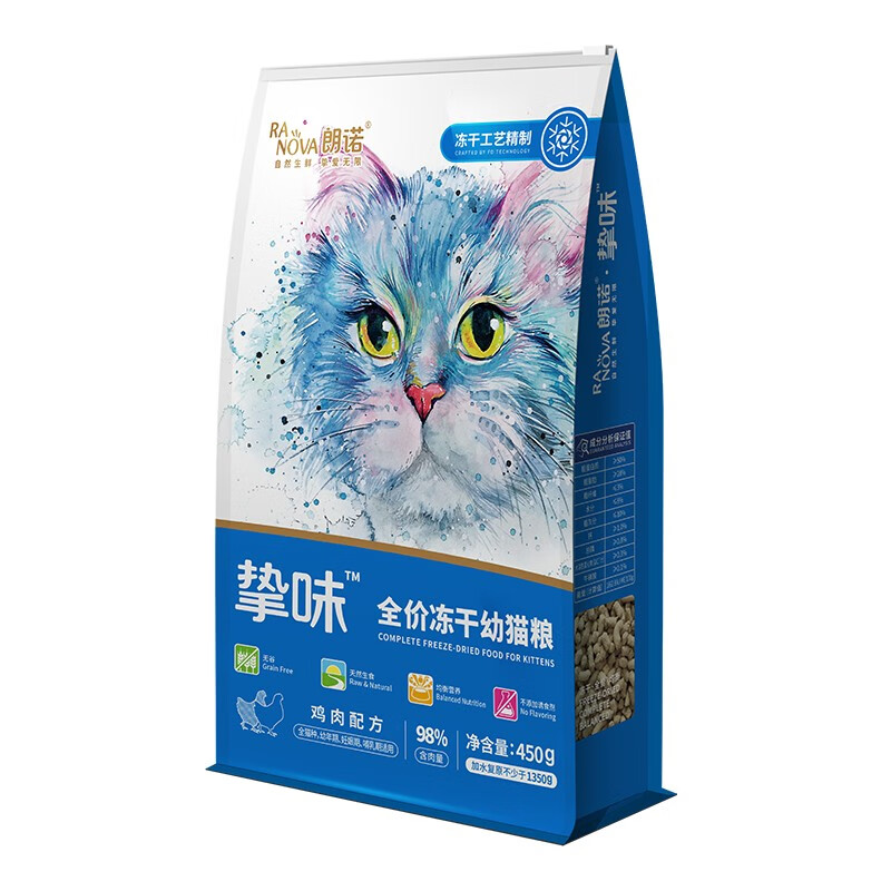 【预售】朗诺冻干主粮 实发幼猫鸡肉450g*2 棒棒糖*1 鸡肉70g*1 小耳袋鸡脖*1 试吃装(2 1)*1含附件含赠品