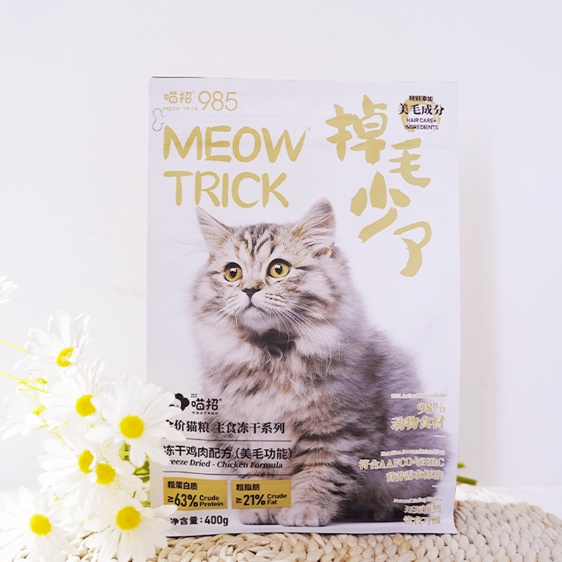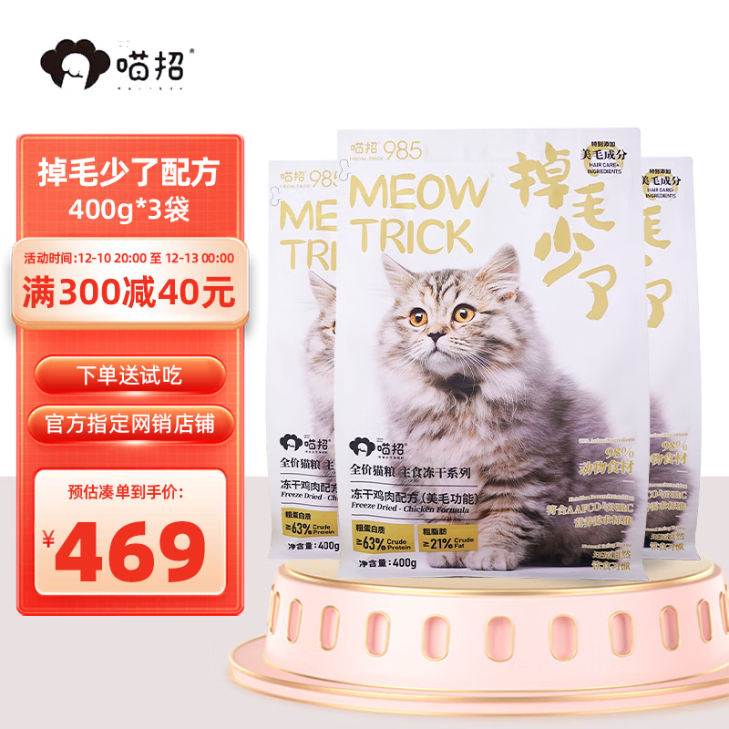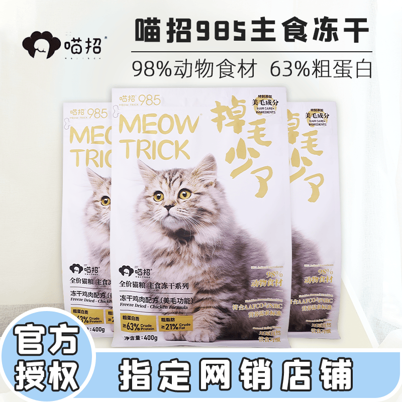 喵招985猫咪主食冻干生骨肉兔肉鸡肉鸭肉配方幼猫成猫全价冻干猫粮 【月餐】掉毛少了400gx3袋 全猫粮