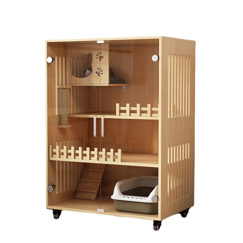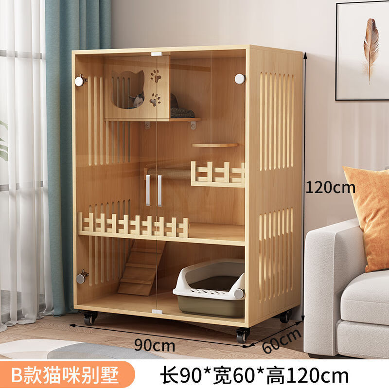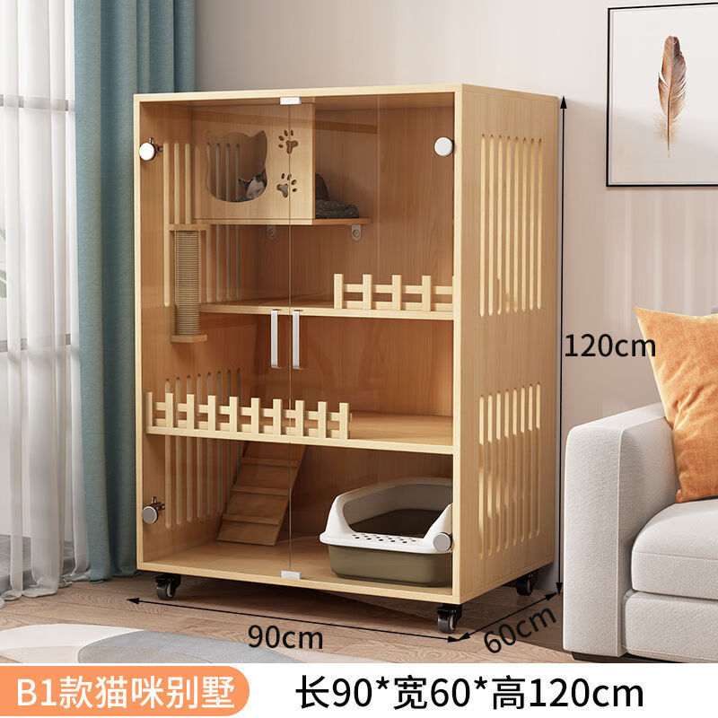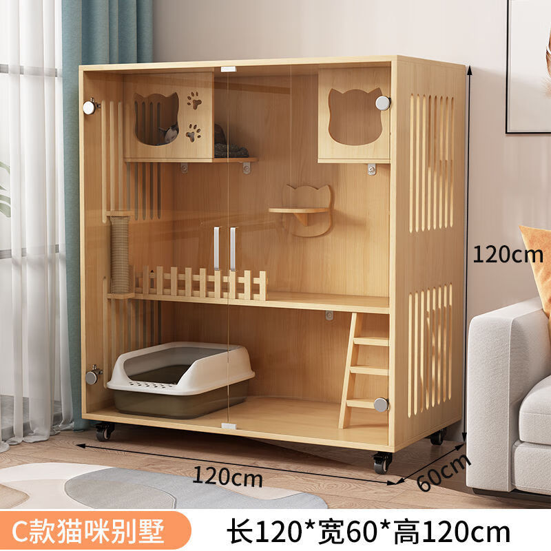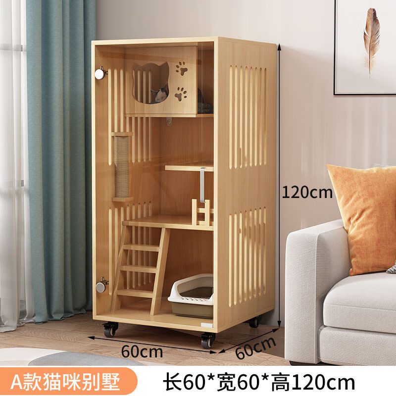 小米城堡 木质猫笼子 家用室内超大自由空间猫舍猫窝猫屋猫柜双层猫别墅 60*60*120:全木质A款 全景钢化玻璃+配货上楼+包安装