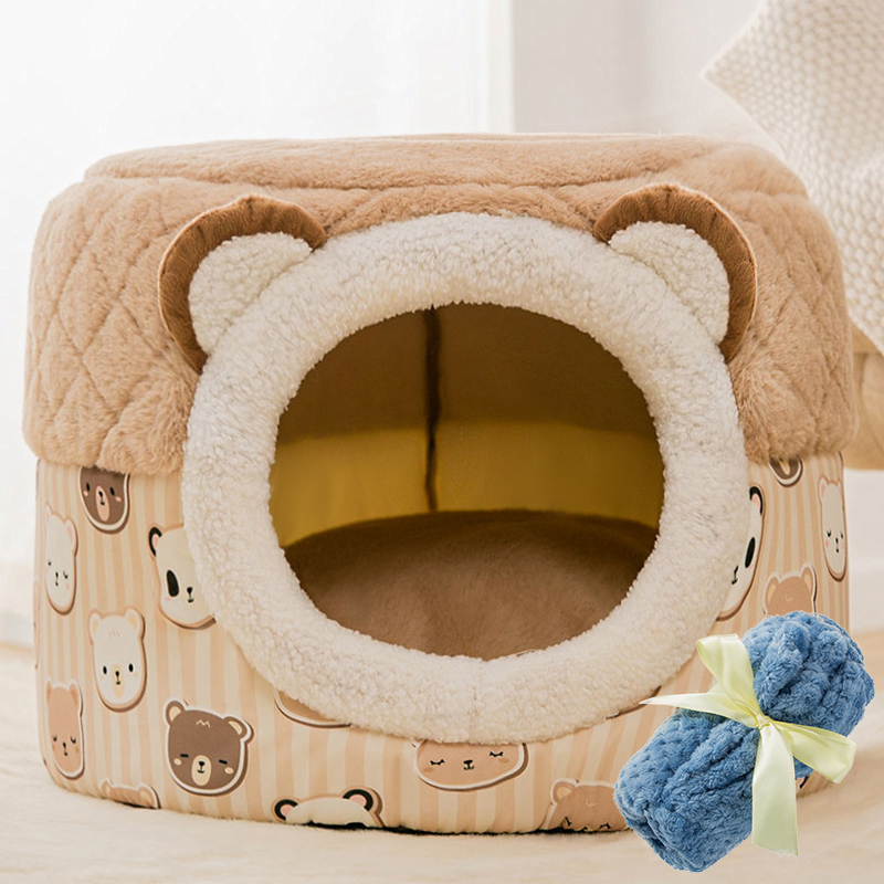 嬉皮狗 猫窝冬天冬季封闭式猫床幼猫冬季保暖窝猫咪宠物窝猫屋猫咪用品 棕色小熊【搭配毛毯】 L-【多只猫咪】猫主子都爱大房子