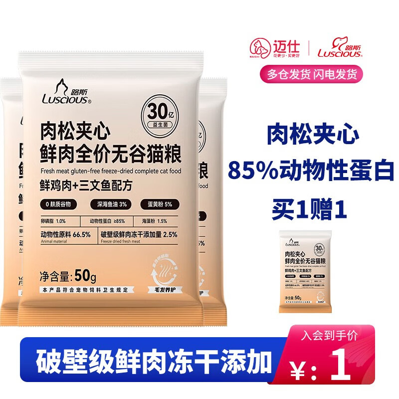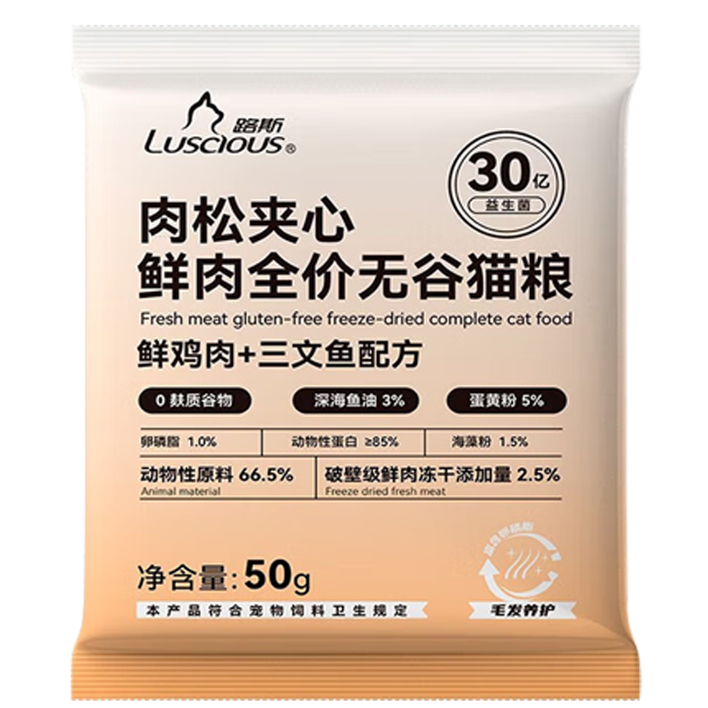 路斯(Luscious) 肉松夹心冻干猫粮2kg成猫幼猫鲜肉无谷全价益生菌全阶段通用粮 试吃装50g【入会 l 元抱邮2袋】