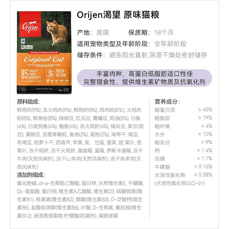 【美版】Orijen原始猎食渴望爱猫幼猫猫粮奶糕鸡肉猫粮增肥发腮