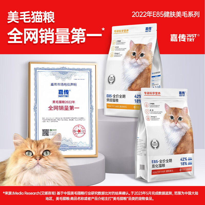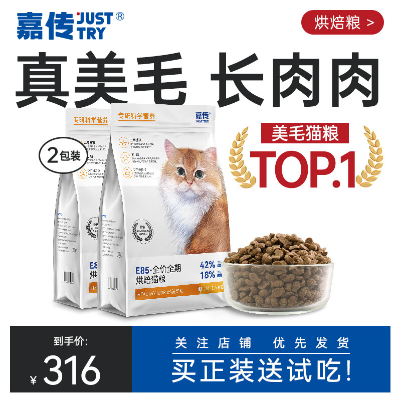 嘉传E85烘焙猫粮无谷全价全阶段成猫幼猫布偶健肤美毛高蛋白粮 3kg 2包装 2包试吃【九成选择】
