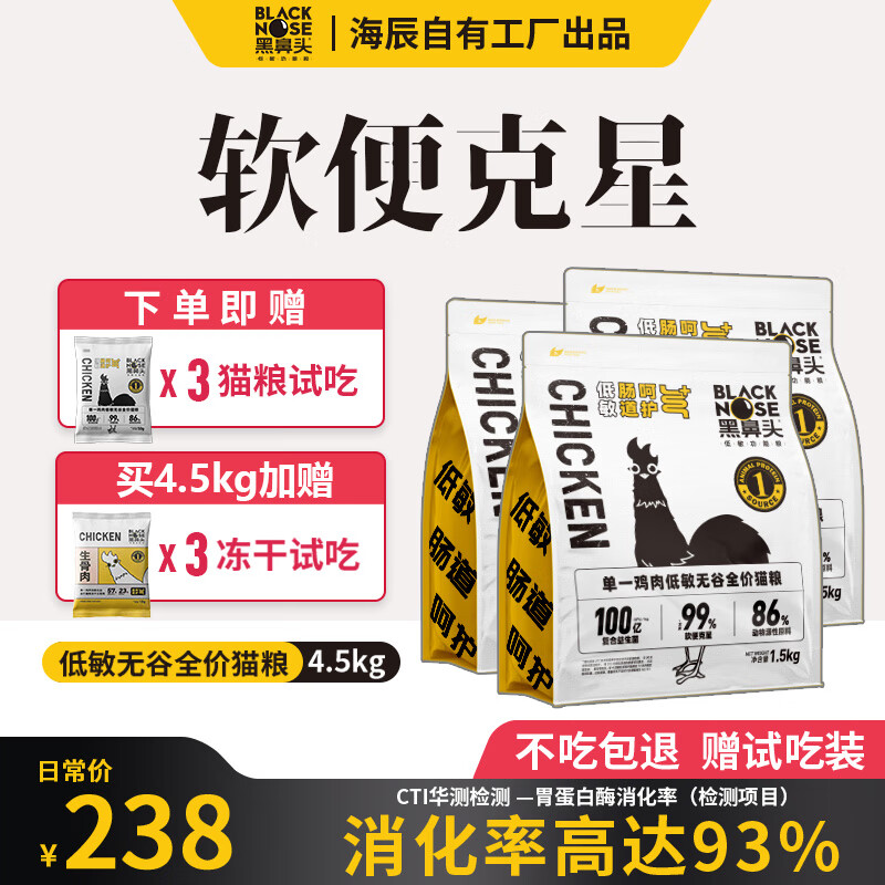黑鼻头低敏猫粮全价成猫幼猫粮无谷猫粮低敏防软便增肥发腮1.5kg高蛋白 3包9斤【 试吃150g 冻干30g】