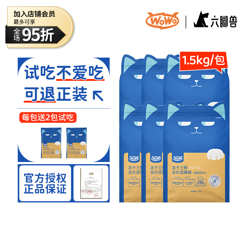 WOWO喔喔猫粮 冻干三鲜胃肠呵护全价成猫粮3种冻干4种肉专治挑嘴 鳕鱼味1.5kg*6赠试吃*12