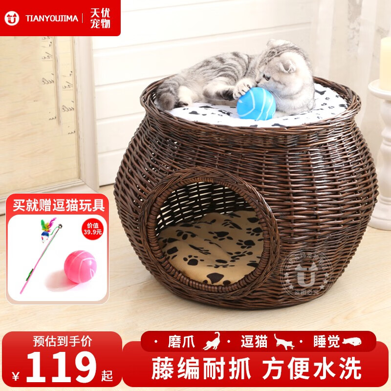 王太医藤编猫窝狗窝夏季凉窝柳编猫舍猫屋猫房子小型犬窝四季通用可拆洗 咖啡色 M中型35*41(建议12斤以内) 单窝 2个软垫 2个凉席