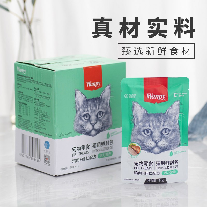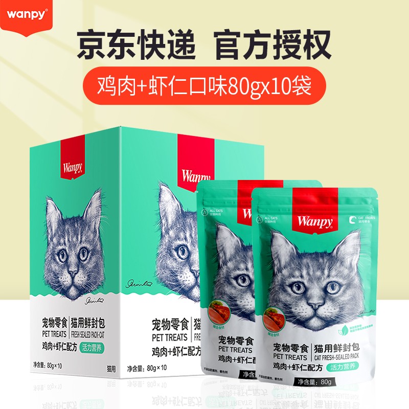 顽皮(Wanpy)猫咪鲜封包 宠物猫粮肉粒包 猫湿粮猫罐头整盒装 鸡肉 虾仁 80*10袋