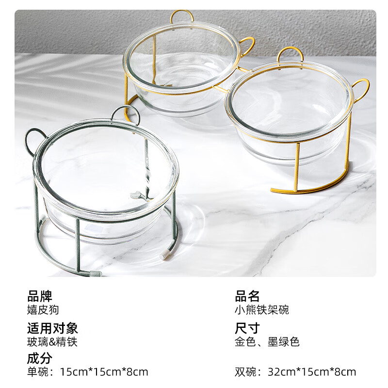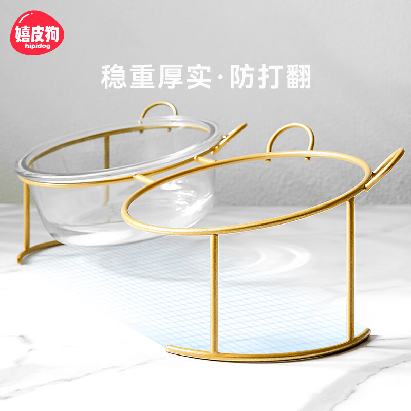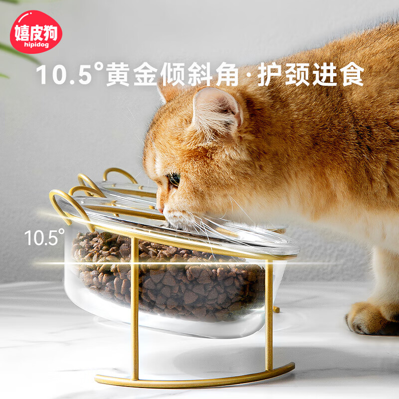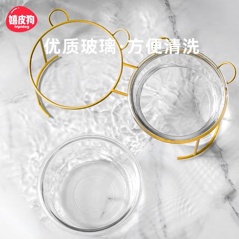 嬉皮狗(hipidog)猫碗玻璃猫食盆双碗狗碗宠物碗猫粮碗水碗猫咪用品保护防打翻 【萌宠小熊】金色#双碗 犬猫通用