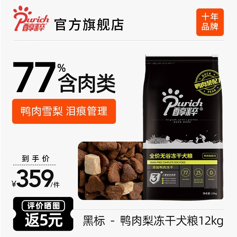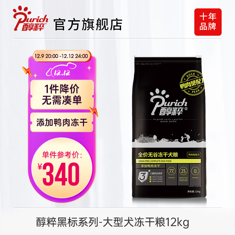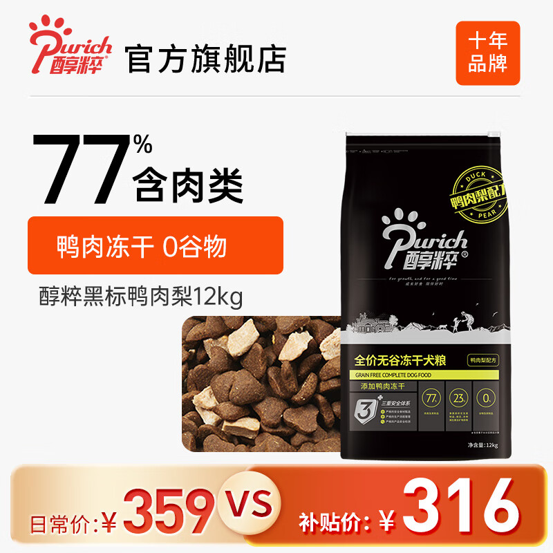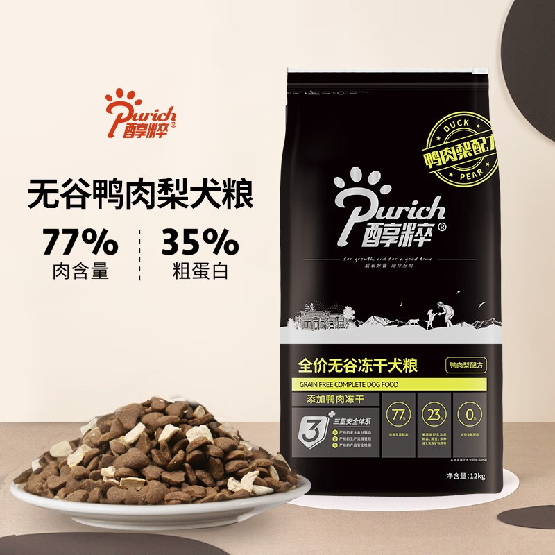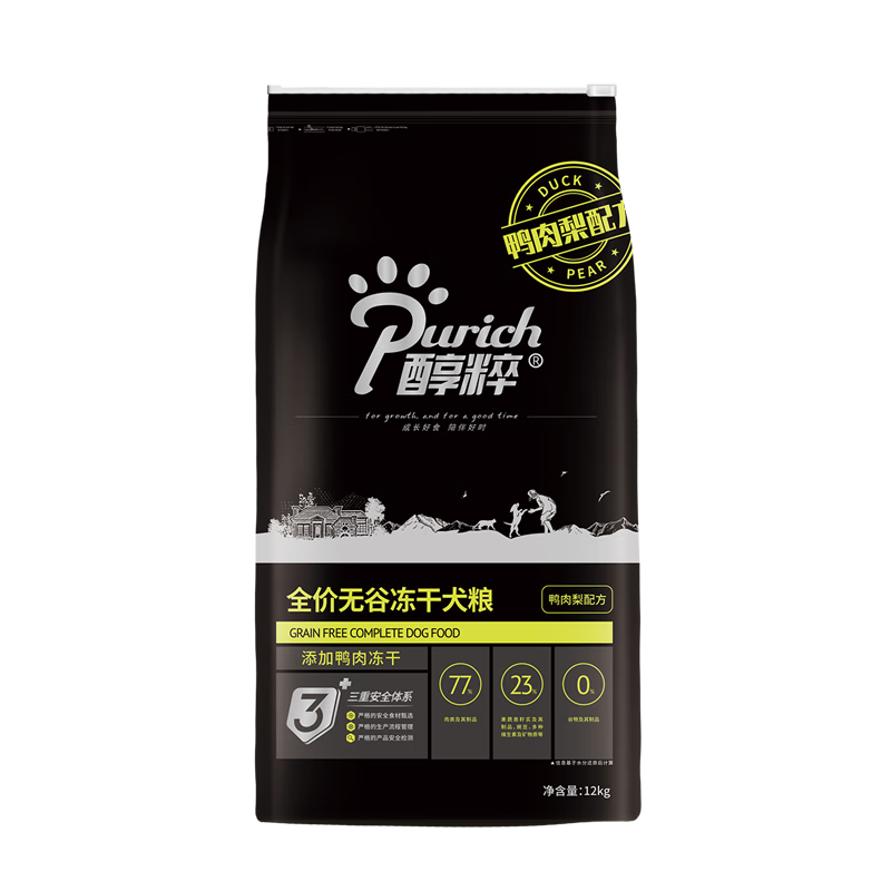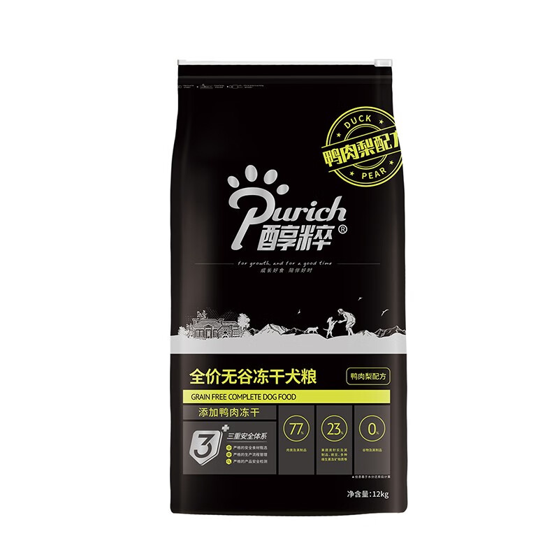 醇粹狗粮 黑标狗粮冻干大中小型全价犬粮成犬幼犬纯粹狗干粮 鸭肉梨12kg(清爽)