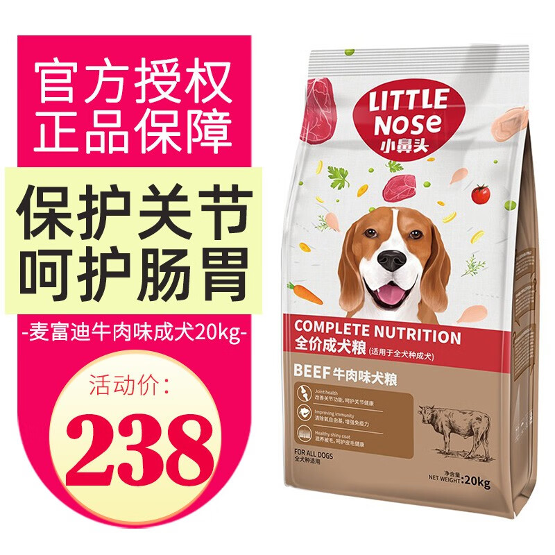 麦富迪 牛肉味狗粮40斤小鼻头大型犬通用金毛拉布拉多哈士奇杜宾恶霸 小鼻头成犬20kg