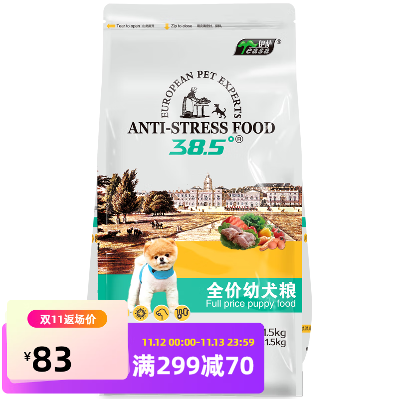 伊萨38.5°狗粮泰迪拉布拉多天然粮金毛狗粮 38.5°幼犬粮1.5kg