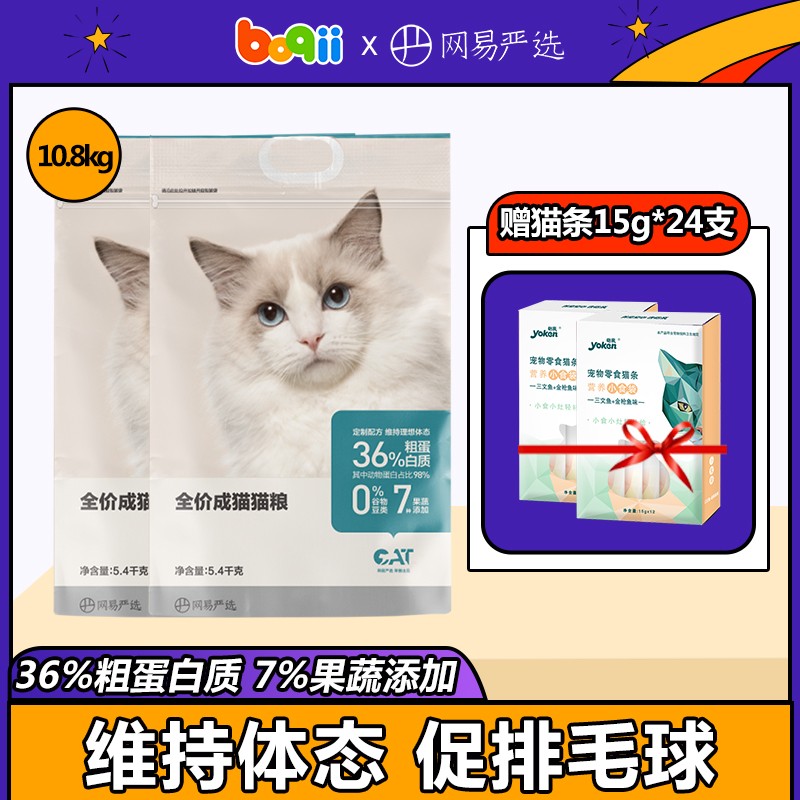 【咨询有喜】网易严选猫粮 幼猫全价猫咪主粮美短英短布偶居家室内宠物主粮 成猫粮10.8kg(5.4kg*2)