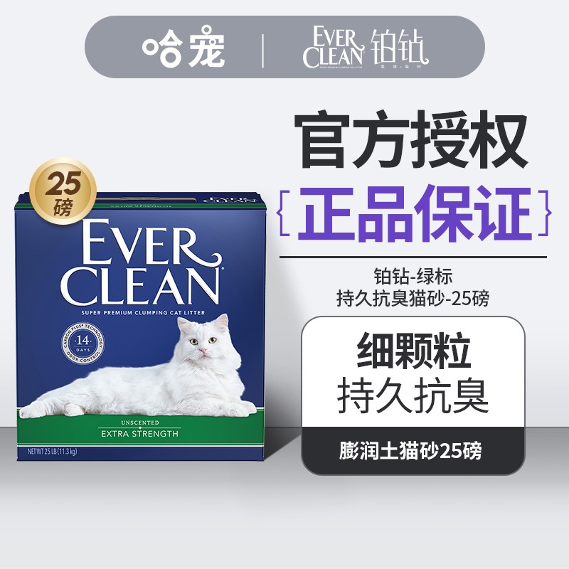 铂钻(EverClean)美国原装进口猫砂25磅蓝白标膨润土绿标蓝标红标猫咪无尘猫沙除臭 持久抗臭低敏猫砂25磅(绿标)