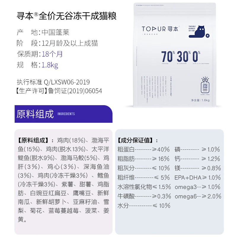 寻本猫粮 70多肉冻干日常喂养全价宠物粮幼猫成猫 70%多肉冻干成猫1.8kg