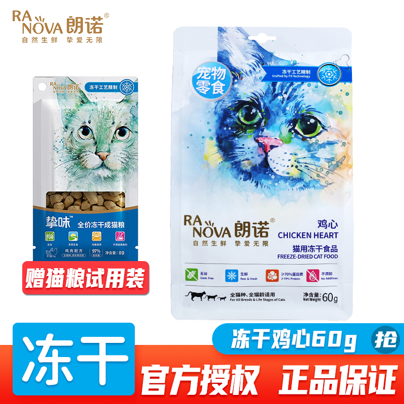 朗诺(RANOVA)冻干肉干猫零食无谷鲜肉猫粮伴侣全期幼猫成猫低敏鸡肉鸭胸肉三文鱼纯肉营养发腮猫冻干 冻干鸡心60g