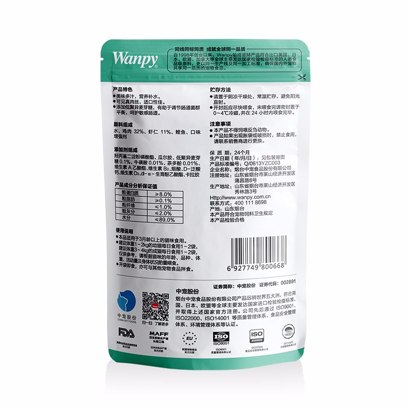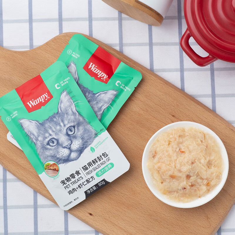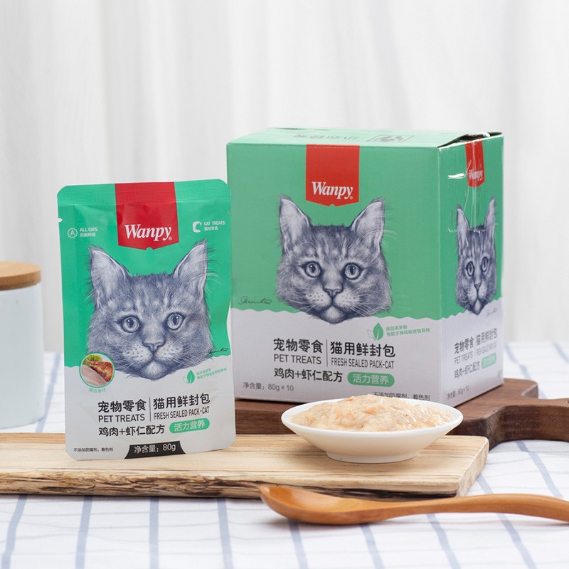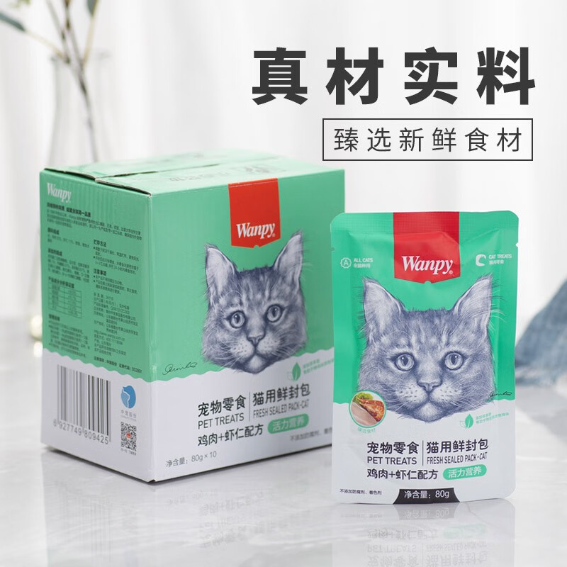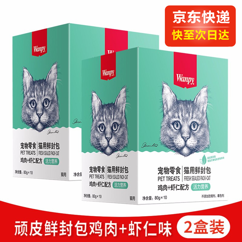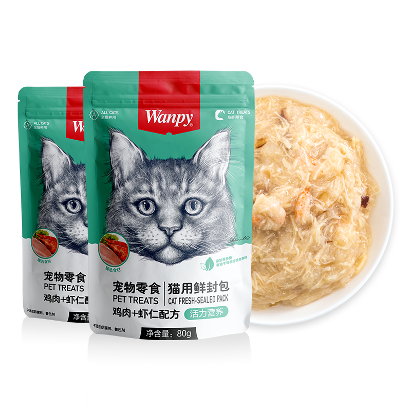 顽皮(Wanpy)猫咪鲜封包 宠物猫粮肉粒包 猫湿粮猫罐头整盒装 鸡肉 虾仁80g*10袋(2盒装)