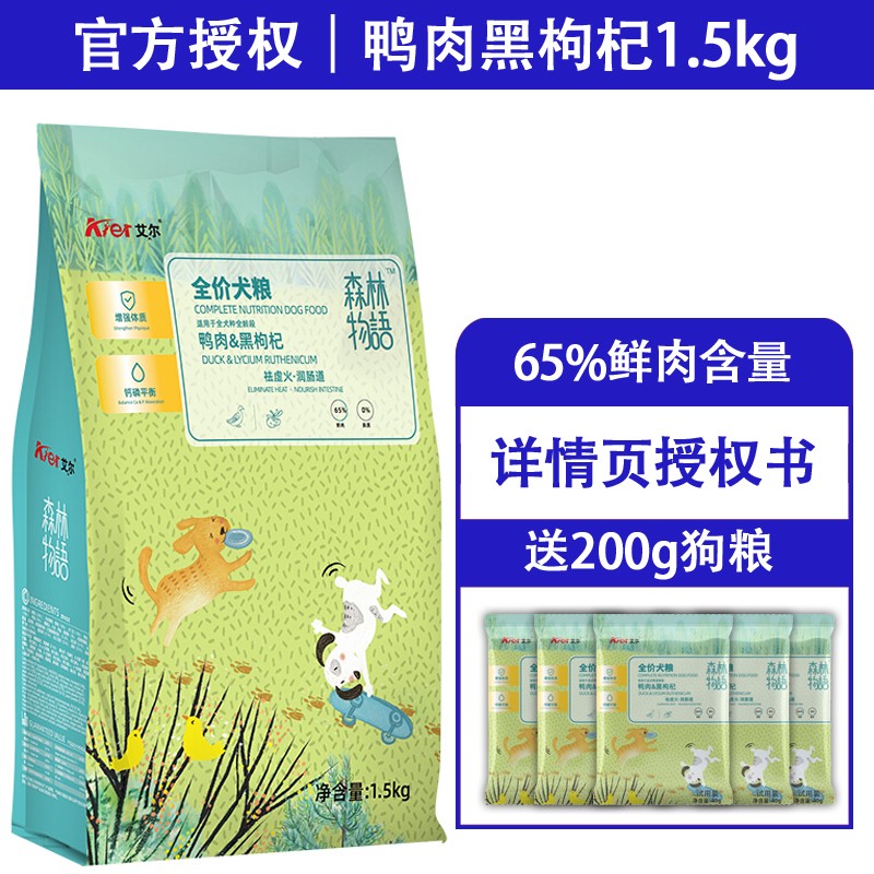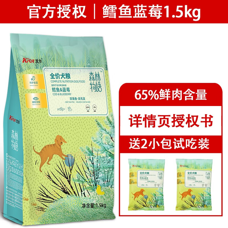 艾尔(Aier)狗粮森林物语狗粮无谷鲜肉全价犬粮低盐低油小颗粒美毛全 鳕鱼蓝莓全犬期狗粮 1.5kg