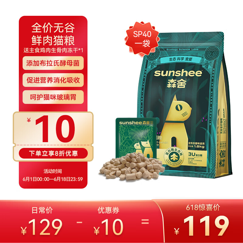 SUNSHEE森舍无谷低敏全价高鲜肉猫粮 天然通用型猫干粮SP40款1.8kg/袋 SP40猫粮*1袋【 1.8kg 】