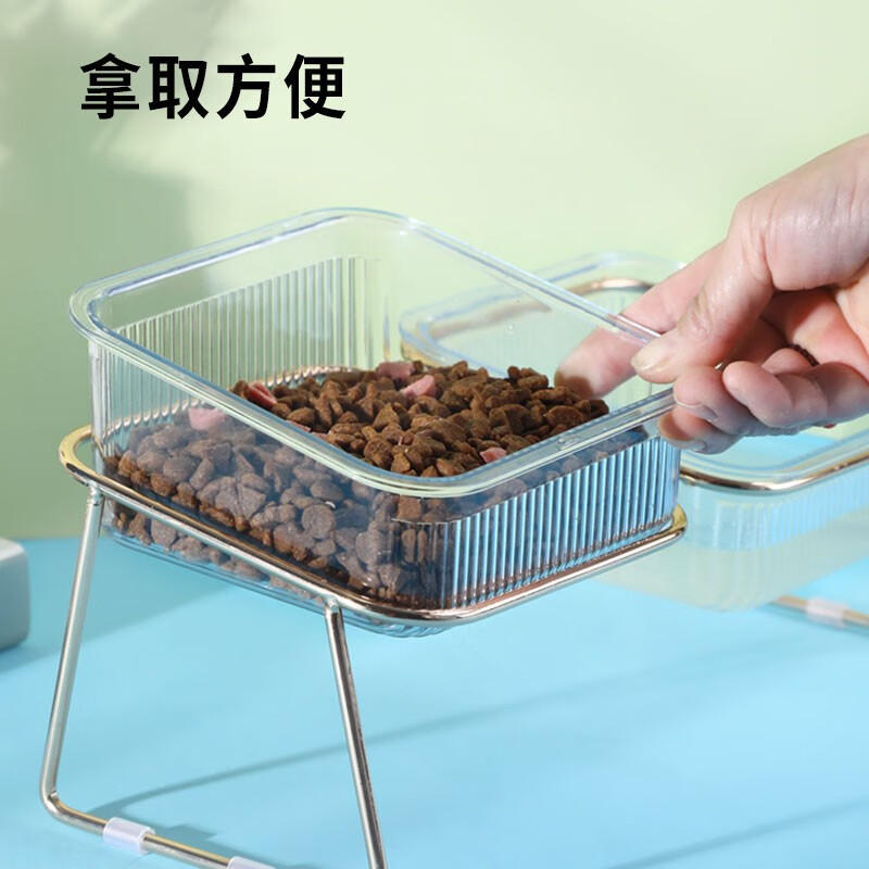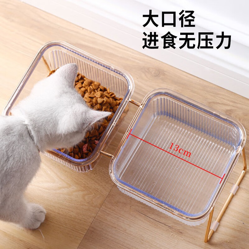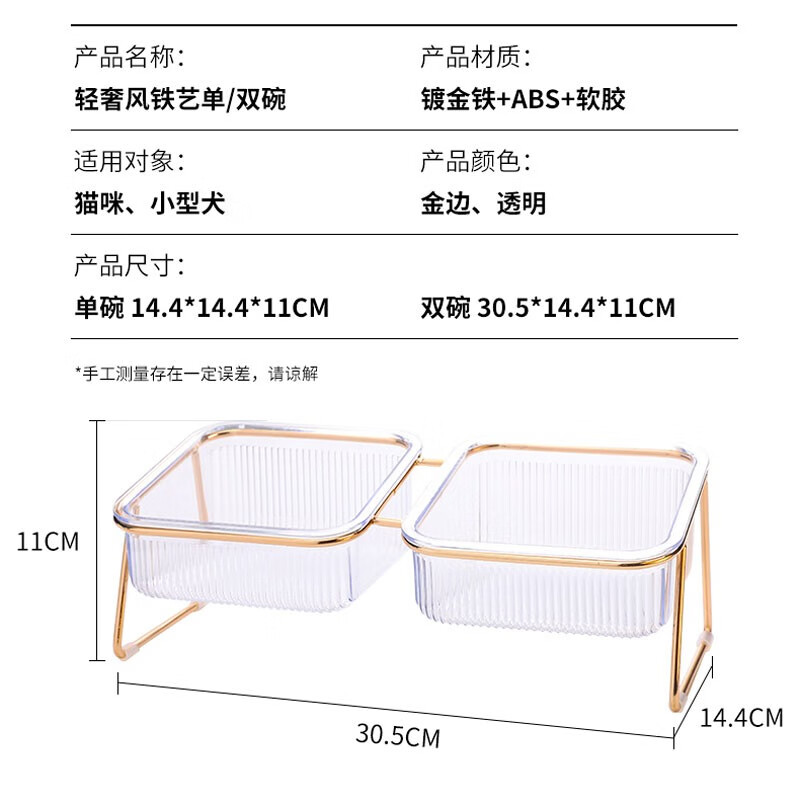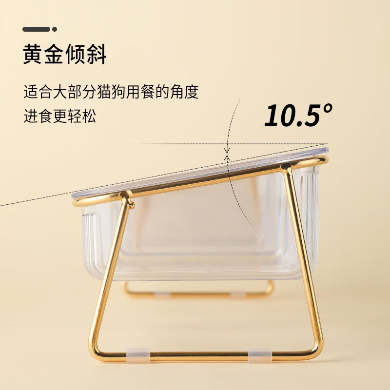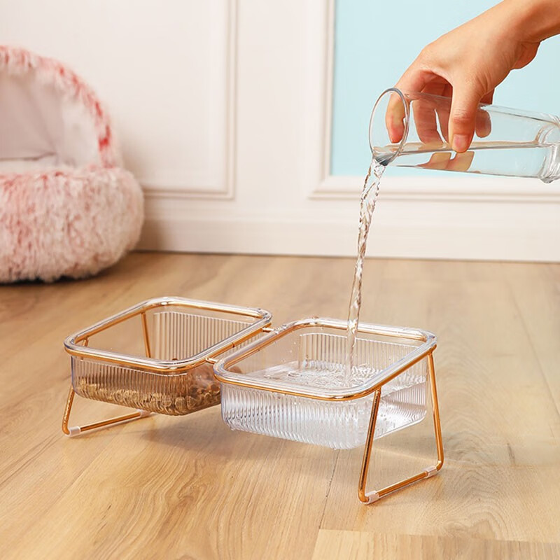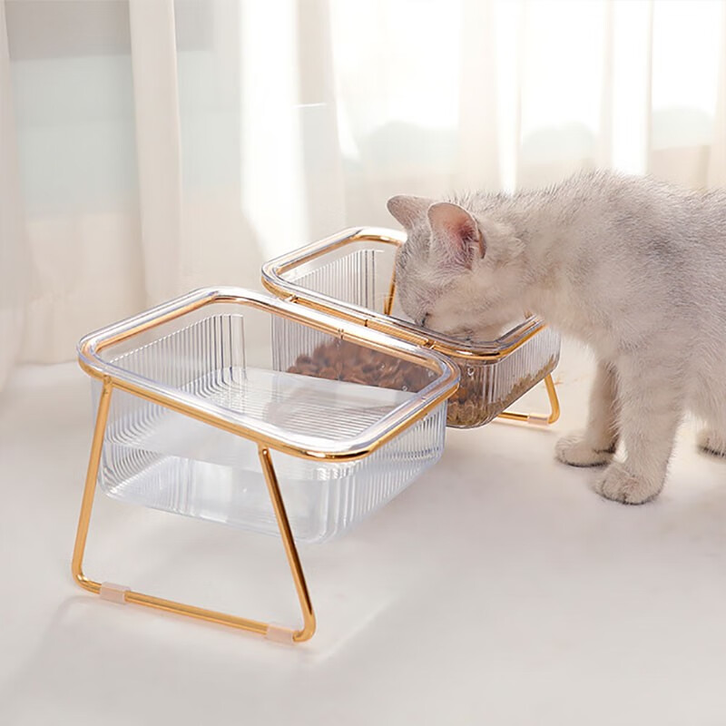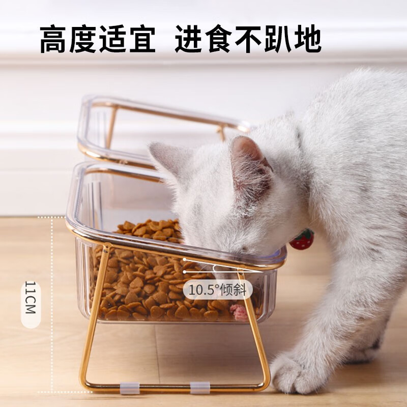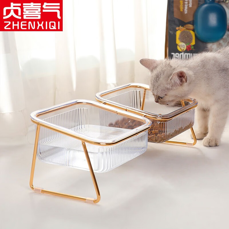 贞喜气 猫碗双碗 猫食盆狗碗水碗猫饭碗斜口猫粮碗铁艺分离式宠物喂食器 金边透明
