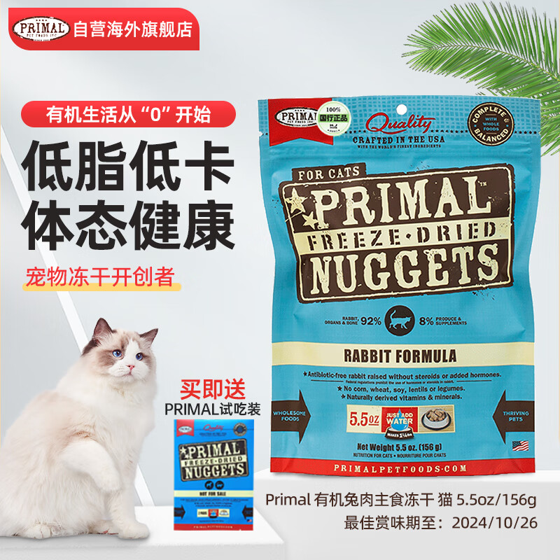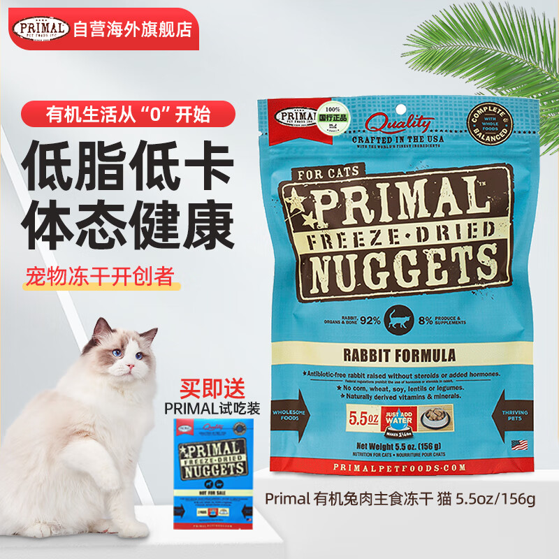PRIMAL猫冻干主食猫咪生骨肉成幼猫pr冻干猫粮有机兔肉味156g