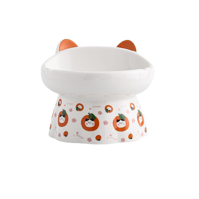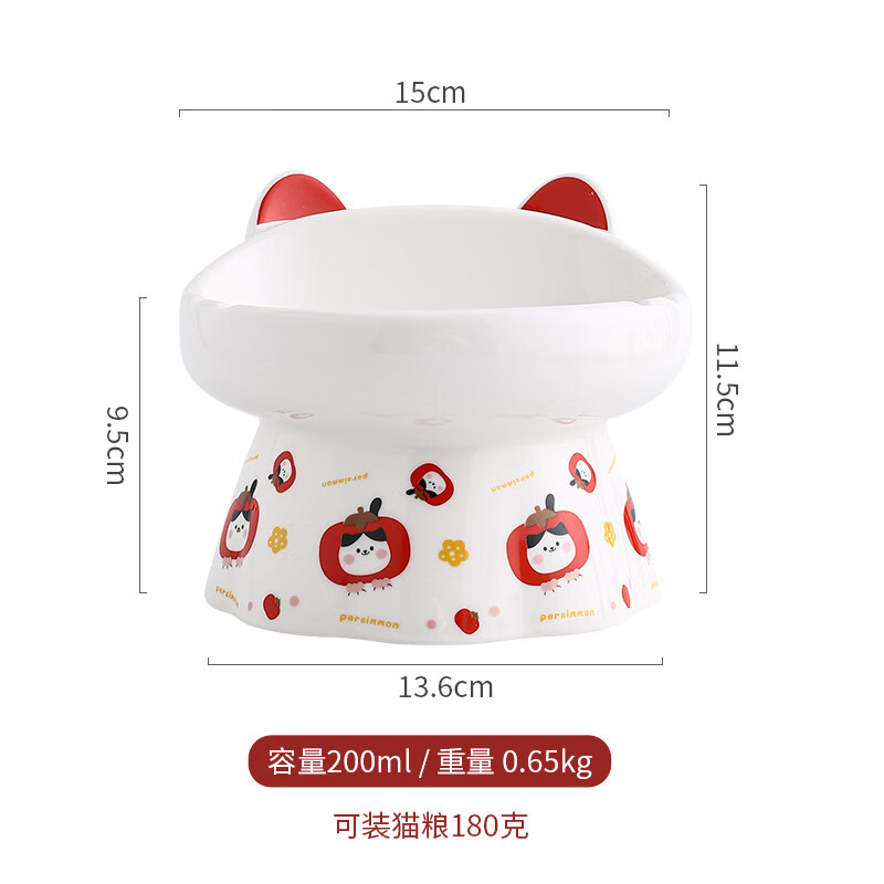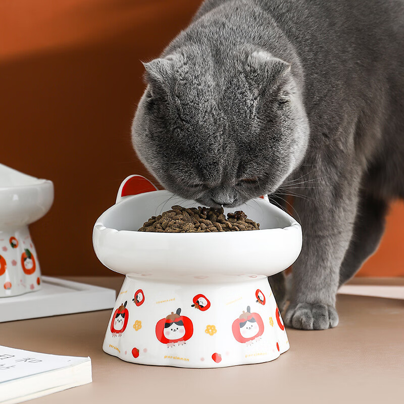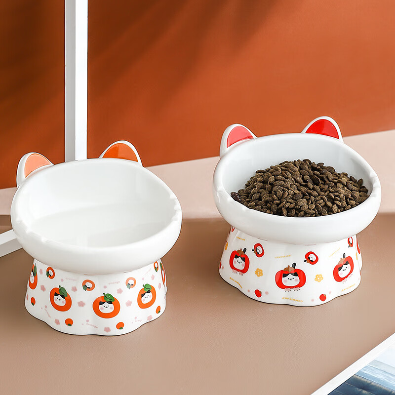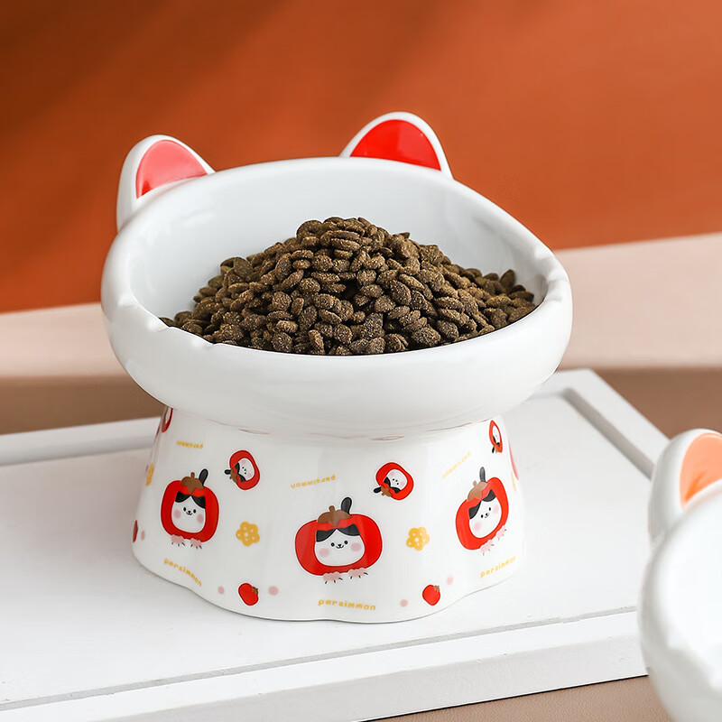 JHHUIYA陶瓷高脚猫碗花边国潮可爱护颈斜口大容量防黑下巴斜口猫碗狗碗 柿柿如意