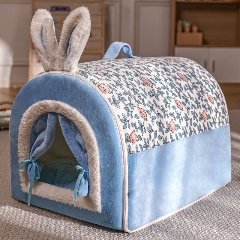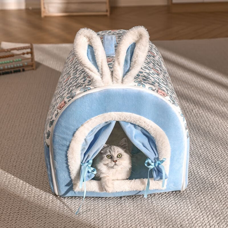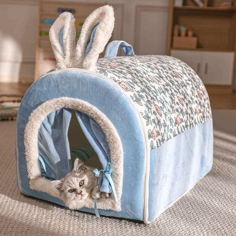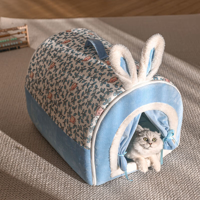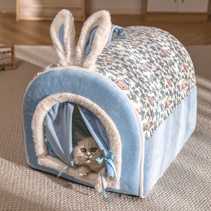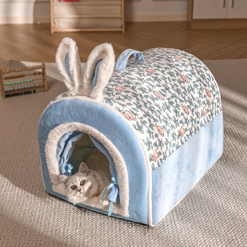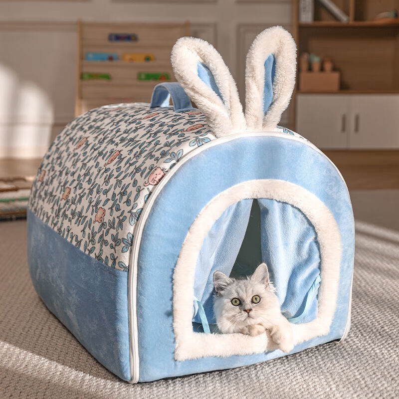 完壮猫窝四季通用冬天保暖可拆洗封闭式别墅房子型狗窝冬季保暖宠物窝 兔耳朵门帘款(全新升级款) S码-建议7斤内猫咪使用