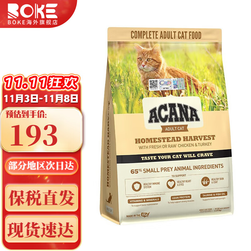 愛肯拿进口猫粮丰收家园成猫鸡肉猫粮美国原装进口1.8kg 鸡肉味 MOA
