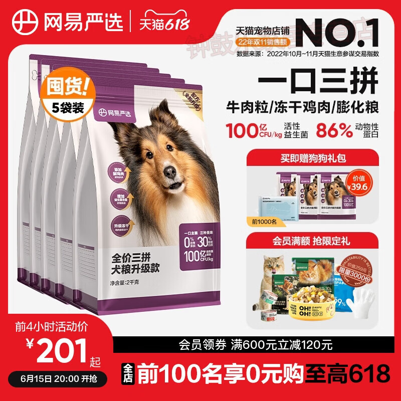 网易严选三拼犬粮 冻干狗粮成犬幼犬小型犬大型犬美毛通用40斤装 鲜鸡肉 肉蔬粒 牛肉 100亿CFU/k 10kg囤货5袋