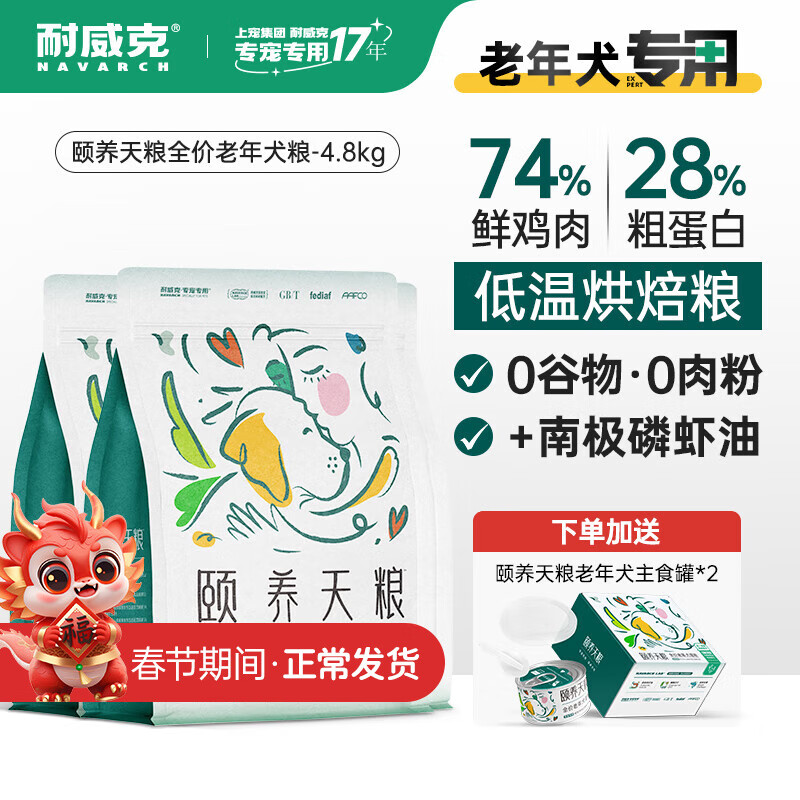 耐威克(Navarch)低温烘焙鲜鸡肉粮 老年犬专用颐养天粮全价无谷物通用型狗粮 4.8kg 主食罐510g