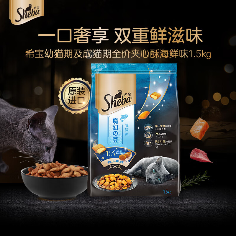 希宝猫干粮幼猫期及成猫期全价夹心酥进口猫干粮招牌海鲜味1.5kg