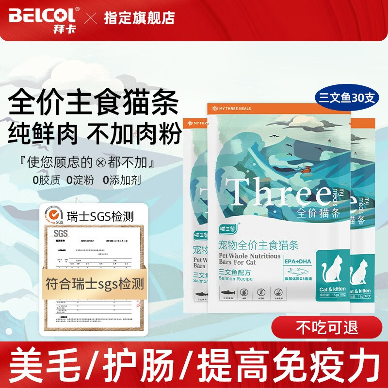 喵三餐主食猫条猫零食鱼油猫条防掉毛幼猫咪猫鱼肉成猫孕猫罐头 三文鱼肉主食猫条10支*3包