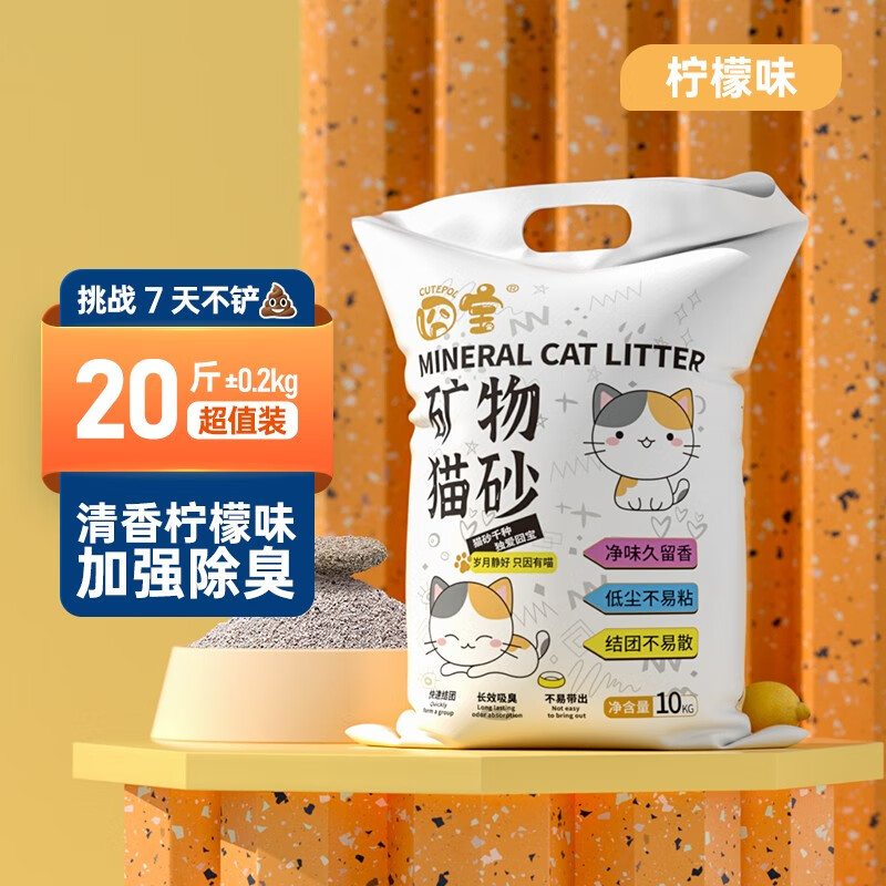 囧宝(CUTEPOL)钠基矿物猫砂原矿破碎除味除臭结团快大颗粒无粉尘吸水快猫咪用品 【无尘10倍除臭】柠檬味矿砂20斤