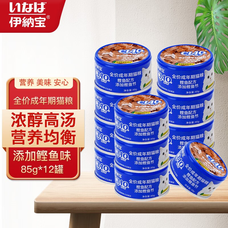 伊纳宝妙好猫罐头 全价成年期猫粮 多种口味猫湿粮汤汁罐 鲣鱼添加鲣鱼节味85g*12罐