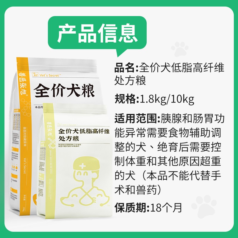 兽医张旭 低脂狗粮胰腺炎处方粮 大小型犬成犬幼犬泰迪金毛通用型干粮 全价配方狗粮犬粮 10kg