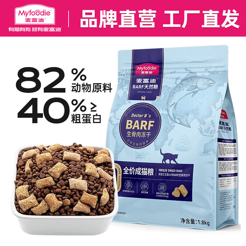 麦富迪 猫粮 barf生骨肉主食冻干双拼天然粮鲜肉营养无谷高肉高蛋白 成猫粮1.8kg|三文鱼 火鸡