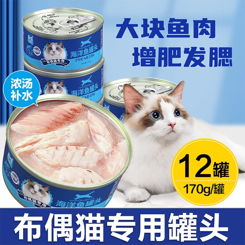 菲喵布偶猫专用猫罐头零食罐海洋鱼肉幼猫拌猫粮猫咪湿粮营养品 12罐170g布偶海洋鱼罐头