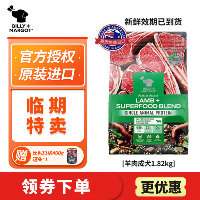 比利玛格(BILLY MARGOT)宠物狗粮澳洲进口全价犬粮无谷低敏通用金毛泰迪狗狗主粮 羊肉1.82kg