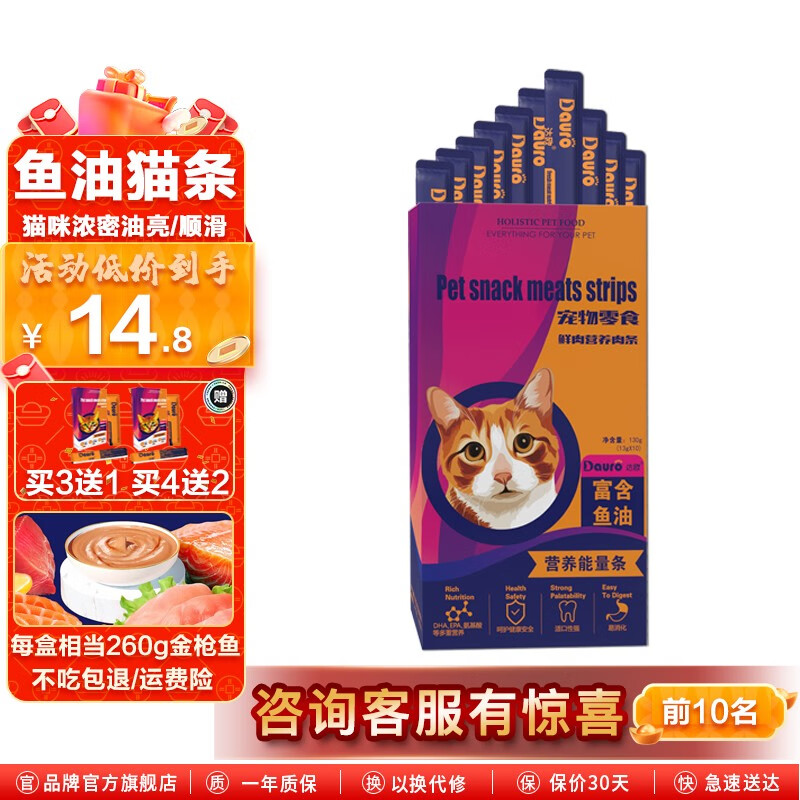 达欧(Dauro)高纯度鱼油猫条猫湿粮 成猫幼猫通用猫咪零食 含鱼油13g*10支【毛发浓密油亮】