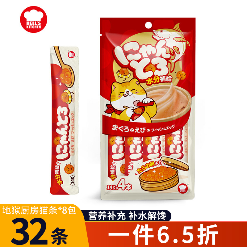 地狱厨房猫条猫零食补水湿粮成猫幼猫营养增肥发腮无诱食剂袋装金枪鱼三文鱼鱼籽味猫酱鲜美 金枪鱼明虾鱼籽*8包(32条)
