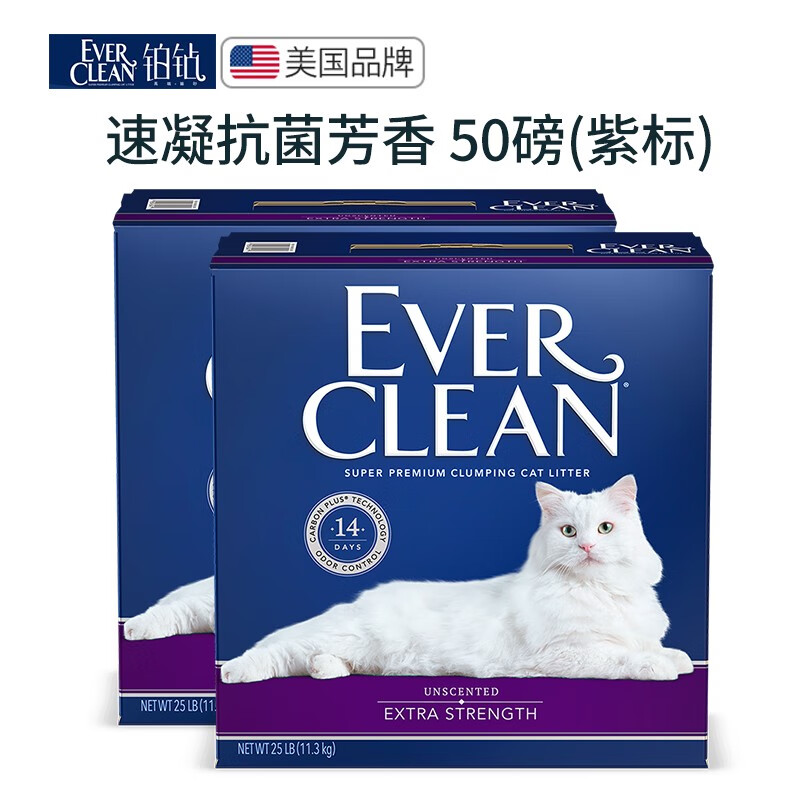 【授权正品】美国进口铂钻猫砂25磅蓝标 EverClean活性炭除臭膨润土矿石无尘25磅11.3kg 紫标-50磅-发2箱