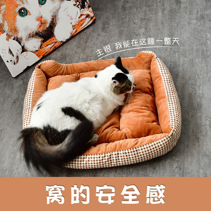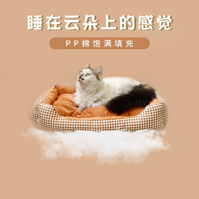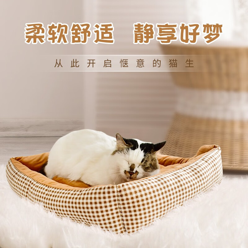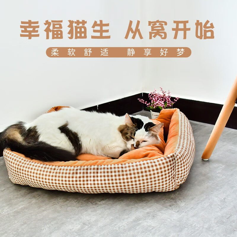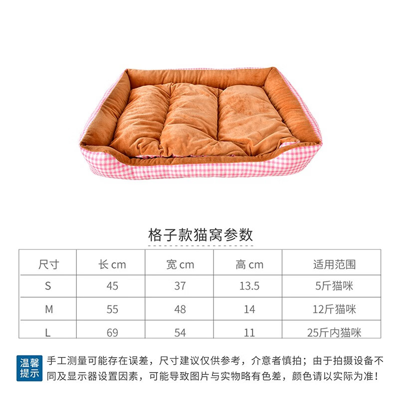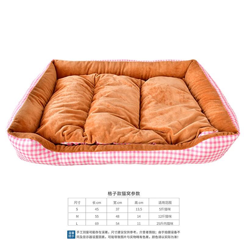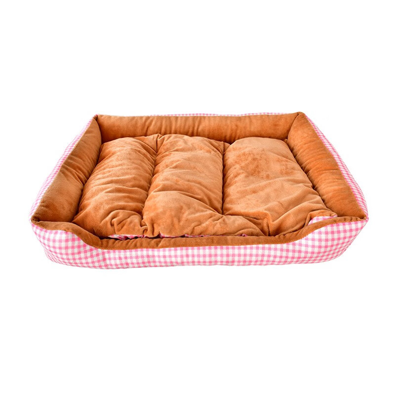 得酷(DEKU)猫窝狗窝宠物方形窝垫保暖棉垫棉窝冬季可机洗 粉色格子 S