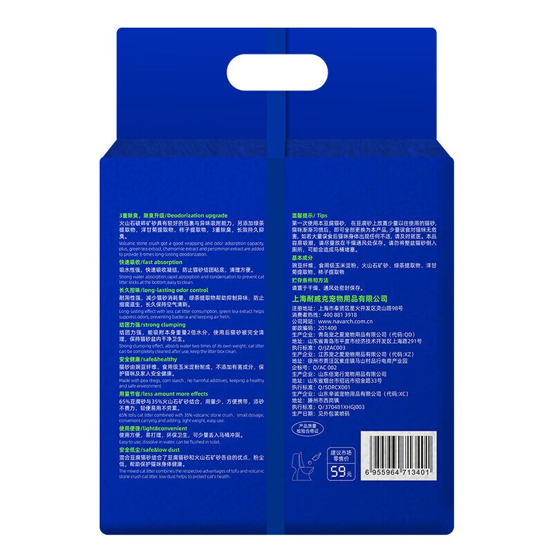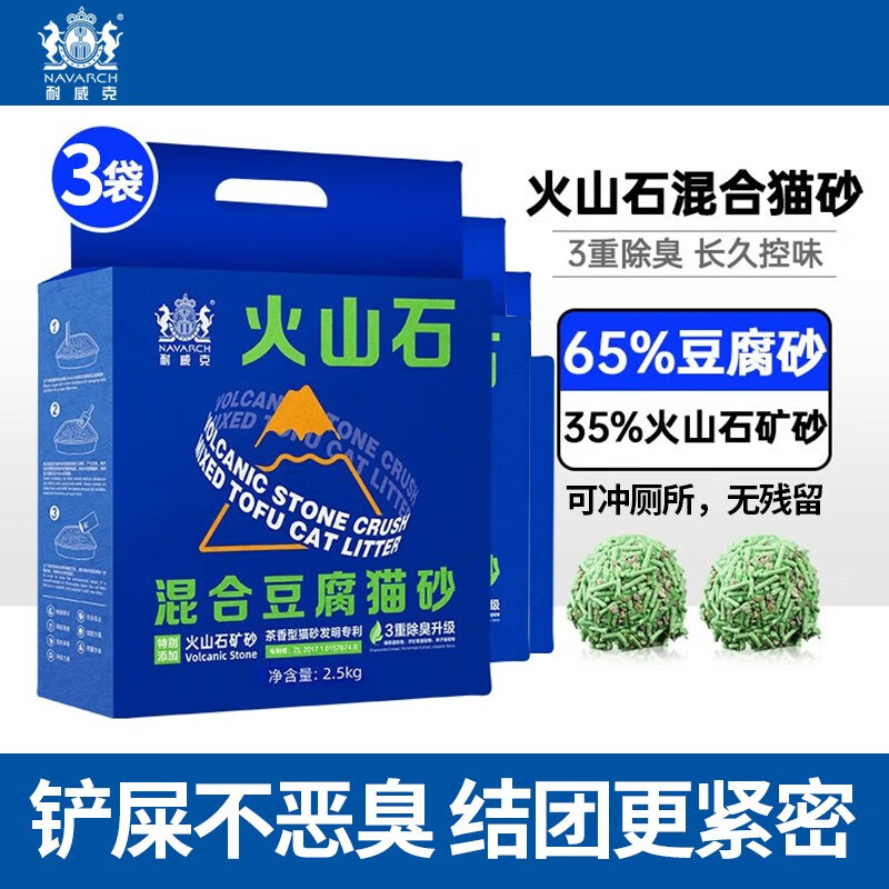 耐威克(Navarch)猫砂纯豆腐混合砂低尘除味快速吸水易结团可冲厕所幼成猫通用 火山石混合砂2.5kg*3袋【2mm三重除臭】