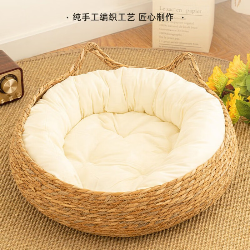 猫窝四季通用冬季保暖猫抓板藤编宠物猫冬猫用品布偶猫窝耐脏 蒲草 白色垫子 靠枕 中型(15斤内猫或狗狗)