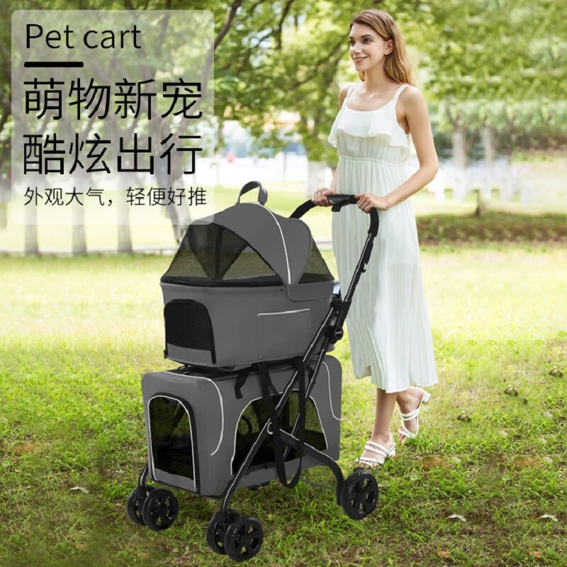 超可耐可拆洗户外出行轻便折叠双层宠物推车可拆卸猫笼分离宠物手推车 浅灰色